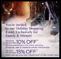 I got this email by invitation from TheBay.ca. This Sunday, the 7th of December 2008, you can get either a 10% discount or a 15% discount in-store. The 10% discount is for anyone, as long as you print and present this invitationwhen you go to The Bay Store Canada. The 15% discount only applies to HBC Mastercard holders, but I’m sure there are a few of those out there!